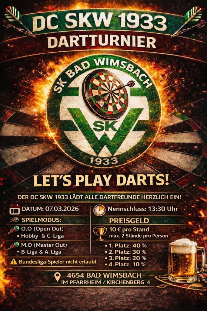 Am 7.3.2026 findet das 1. Dartturnier unseres Dartclubs im Pfarrheim Bad Wimsbach statt. Für Hobby- und C-Liga Spieler gilt der Spielmodus O.O (OpenOut) und für B-Liga & A-Liga Spieler gilt der Spielmodus M.O (Master Out) – Bundesliga Spieler sind nicht zugelassen.