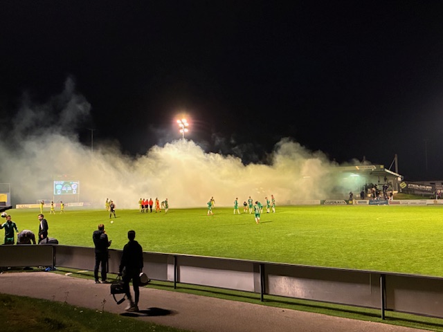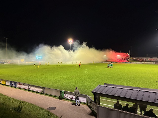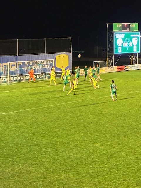 Mit viel Elan und vorerst viel Rauch starten die Grün-Weißen in die Partie gegen Esternberg. Als sich der Rauch verzogen hatte gaben die Wimsbacher gleich Gas – schon nach 9 Minuten scheint es, dass Max Hochreiter den SKW in Führung bringt, doch der Goalie der Gäste klärt den Kopfball gegen die Laufrichtung unglaublich zur Ecke. 10 Minuten später dann Hadzic mit seiner ersten Möglichkeit, aber der Schuss fällt zu zentral aus. Die Esternberger machen hinten dicht und kommen in Halbzeit eins einmal gefährlich vor Tor von Goalie Seyr, der den im eins gegen eins klären kann. Ein Foul von hinten an Stockinger bleibt vom Schiedsrichter ungesühnt und es bleibt bei völligem Unverständnis nur bei einer Ermahnung…
