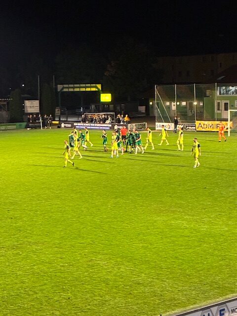 4 Minuten später dann ROT für Kevin Prielinger, in einem Laufduell läuft der seinen Gegenspieler ab und zur weiteren allgemeinen Verwunderung gibt es nun die Rote Karte wegen angeblicher Tätlichkeit – woher diese Entscheidung kommt, kann leider niemand nachvollziehen.