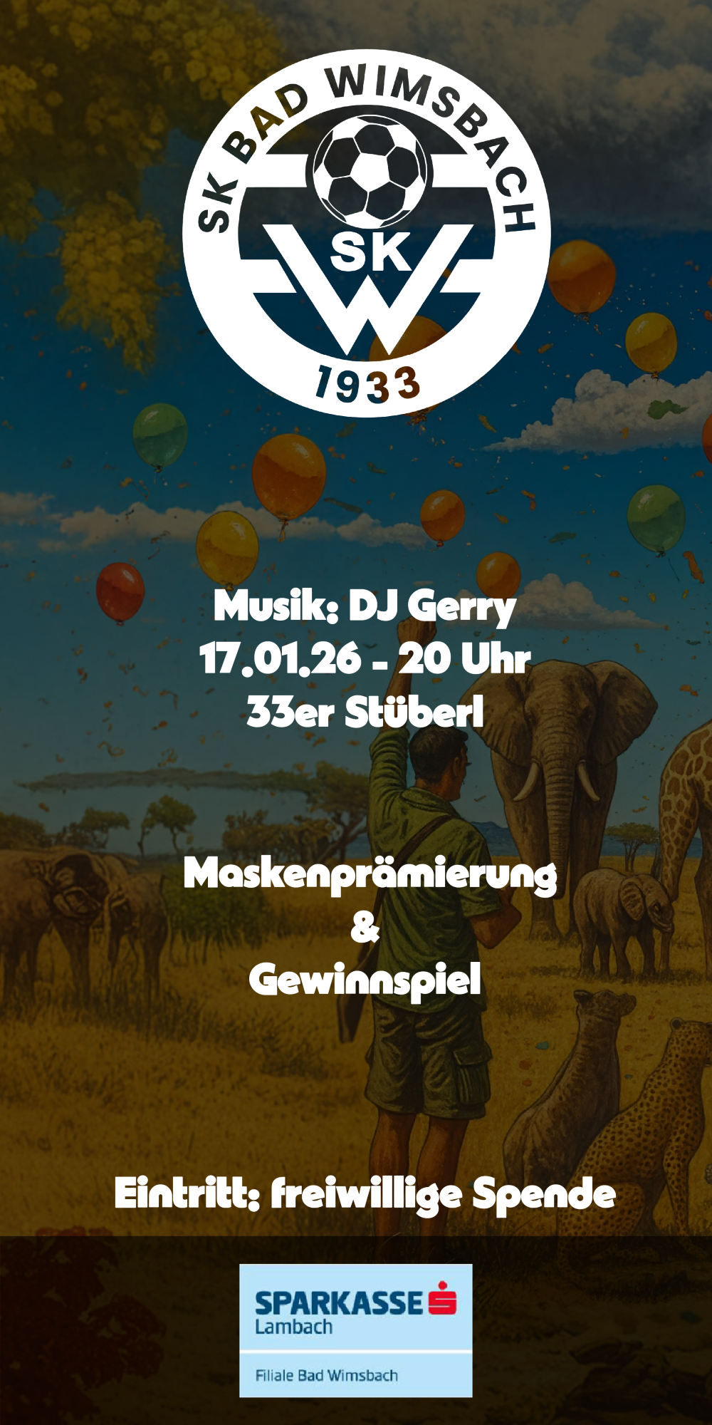 Am Samstag 17. Jänner 2026 steigt im 33er SKW-Stüberl der Safari-Maskenball der Grün-Weißen. Mit DJ Gerry geht es lustig durch den Abend – die besten Einzel-, Paar- und Gruppenmasken werden dabei prämiert. Eintritt ist Frei
